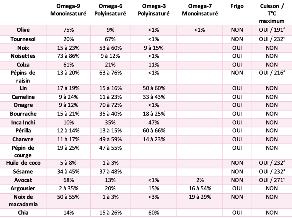Dans la majorité des huiles, il y a des Omega 9 et 6 dont le pourcentage diffère en fonction des variétés (voir le tableau ci-dessous). Les huiles riche en Omega 3-DHA contiennent également souvent des Omega-6. Si vous souhaitez varier les plaisirs et les saveurs, faites vos mélanges d’huile en essayant de toujours garder en tête, il faut plus d’omega-9 que de 6 et il faut autant d’omega-3 que de 6.