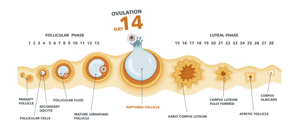 • Du 1er au 14ème jour – la première partie du cycle, la phase folliculaire. Les follicules sont fabriqués au sein des ovaires et donneront un ovule. Durant cette période, l’hypophyse sécrète la FSH, l’hormone qui stimule la production de follicules au sein de l’ovaire, ces derniers permettant la sécrétion des oestrogènes. Les oestrogènes permettent aussi à l’endomètre de s’épaissir (préparation de l’utérus pour accueillir une fécondation).